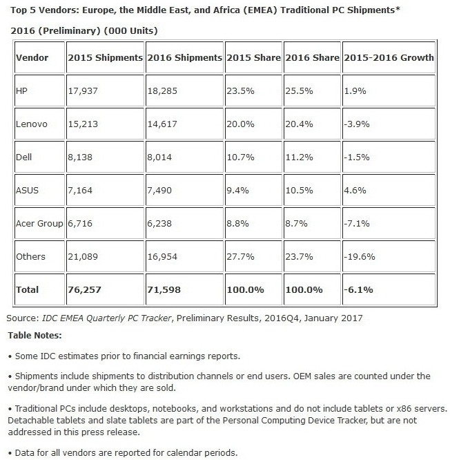 Bei den größten Herstellern von Notebooks in EMEA bleibt die Rangfolge in der Top 5 auch für Q4/2016 und das Gesamtjahr 2016 bestehen. An der Spitze kann sich HP mit einem Wachstum von 1,9 Prozent in 2016 (Q4/2016: 6,4 %) und insgesamt fast 18 Millionen PCs auf Platz 1 behaupten. Dahinter folgt auf Rang 2 Lenovo mit minus 3,9 Prozent, aber plus 8,2 % in Q4/2016. Dell behält mit minus 1,5 Prozent (Q4/2016: plus 9,3 %) Position 3 vor Asus und Acer.