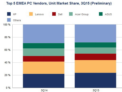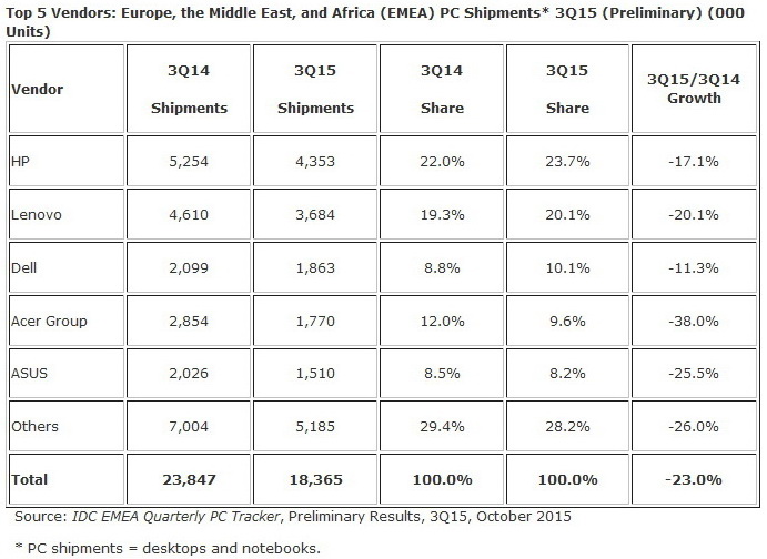Im Top 5 Ranking der wichtigsten Hersteller von Desktops und Notebooks in EMEA weist das Zahlenwerk von IDC für alle Marken unisono deutliche Verluste bei den PC-Absatzzahlen aus. Hewlett-Packard (HP) bleibt mit 4,353 Millionen PCs (- 17,1 %) vor Lenovo mit 3,684 Mio. (- 20,1 %) auf Platz 1. Dell auf Rang 3 weist von allen Brands der Top 5 mit 11,3 Prozent und 1,863 Millionen Einheiten den geringsten Schwund auf. Acer stürzte weiter ab und brachte es nur noch auf Position 4 und 1,77 Mio. PCs. Platz 5 bleibt für Asus. Für den taiwanischen Hersteller verzeichnete IDC nur noch 1,51 Millionen.