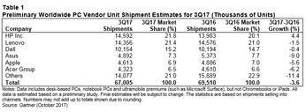 Während IDC in seiner aktuellen Einschätzung für den PC-Markt im 3. Quartal 2017 praktisch eine Nullrunde sieht, bewertet Gartner die Marktentwicklung deutlich pessimistischer. Laut den vorläufigen Ergebnissen von Gartner sanken die weltweiten PC-Verkaufszahlen in Q3/2017 um 3,6 Prozent. Dies entspricht einem Rückgang um 3,6 Prozent im Vergleich zum dritten Quartal 2016.