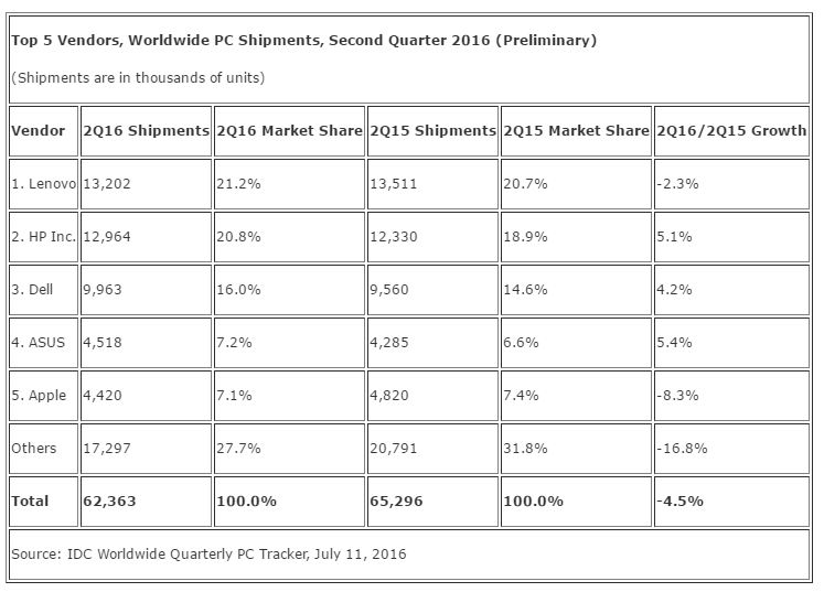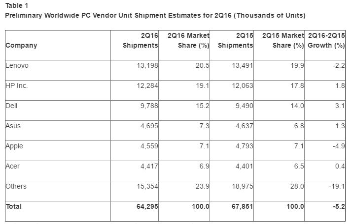 Ein Licht am Ende des Tunnels? Für die geschundenen PC Hersteller ist wohl jede noch so kleine Positivmeldung wichtig. Eine Solche kommt heute von den Marktforschungsunternehmen IDC und Gartner, und zwar in Form der Marktentwicklung im PC Markt für das vor kurzem zu Ende gegangene zweite Quartal 2016. Und zwar sind sich beide Institute einig, dass der PC Markt weniger stark zurückgegangen ist als vermutet. Laut Gartner ging es Weltweit 5,2 % bergab, laut IDC 7,4 % - gerechnet hatte IDC mit einem Rückgang um 10 %. Ebenfalls positiv: Beide Institute sind der Meinung, dass der PC Markt in den USA sogar gewachsen ist, um 1,4 % (Gartner) bzw. 4,9 % (IDC), was jedoch nicht ausgereicht hat um den Weltweiten Rückgang aufzufangen.