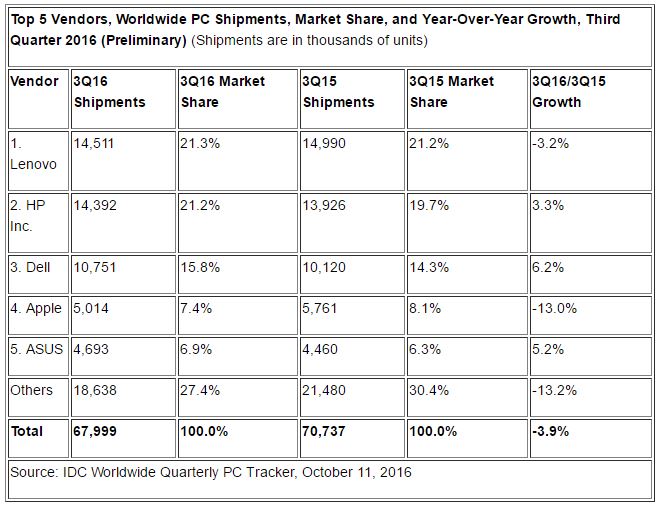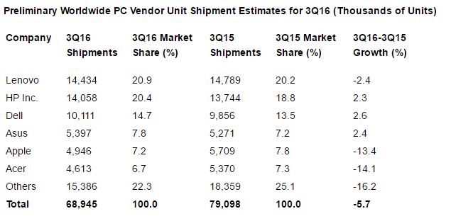 Die beiden in dem Bereich führenden Marktforschungsunternehmen Gartner und IDC haben mal wieder neue Quartalszahlen zur Entwicklung des PC-Marktes herausgegeben. Und obwohl bei beiden die Zahlen etwas anders sind, ist der Trend für den Markt weiter ganz klar: Es geht nach unten. Denn sowohl bei Garnter, als auch bei IDC wurde im 3. Quartal 2016 weniger PCs verkauft als im 3. Quartal 2015. IDC weist hier ein Minus von 3,9 % aus (67,99 Millionen PCs statt 70,73 Millionen), Gartner sogar ein Minus von 5,7 % (68,94 statt 79,09 Millionen Einheiten). Der Unterschied kommt vermutlich vor allem dadurch zustande, dass IDC Chromebooks mit einberechnet, während diese bei Gartner nicht als PCs gewertet werden.