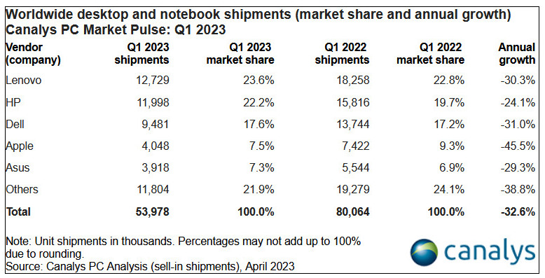 Lenovo musste mit 12,7 Millionen PCs einen starken jährlichen Rückgang von 30 Prozent hinnehmen, behauptete sich mit einem Marktanteil von 24 % aber weiter an der Spitze des Weltmarkts für Desktops und Notebooks. HP belegte den zweiten Platz mit einem weniger dramatischen Rückgang von 24 % auf 12,0 Millionen ausgelieferte PCs. Der drittplatzierte Dell verzeichnete einen Rückgang von 31 % auf historisch niedrige 9,5 Millionen PCs (seit Q1/2018).