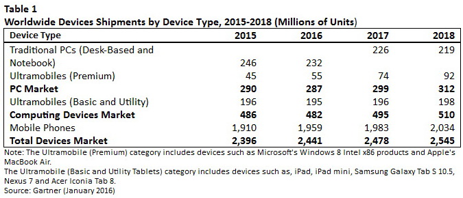 Weltweit werden in diesem Jahr 2,4 Milliarden Geräte (PCs, Tablets, Ultramobiles und Mobiltelefone) verkauft werden, heißt es in der aktuellsten Prognose des IT Research- und Beratungsunternehmens Gartner. Liegt Gartner mit seiner Einschätzung richtig, dann entspricht das einem Anstieg um 1,9 Prozent im Vergleich zu 2015. Die Ausgaben der Endnutzer (bezogen auf den US-Dollar) sollen erstmals um ein halbes Prozent sinken.