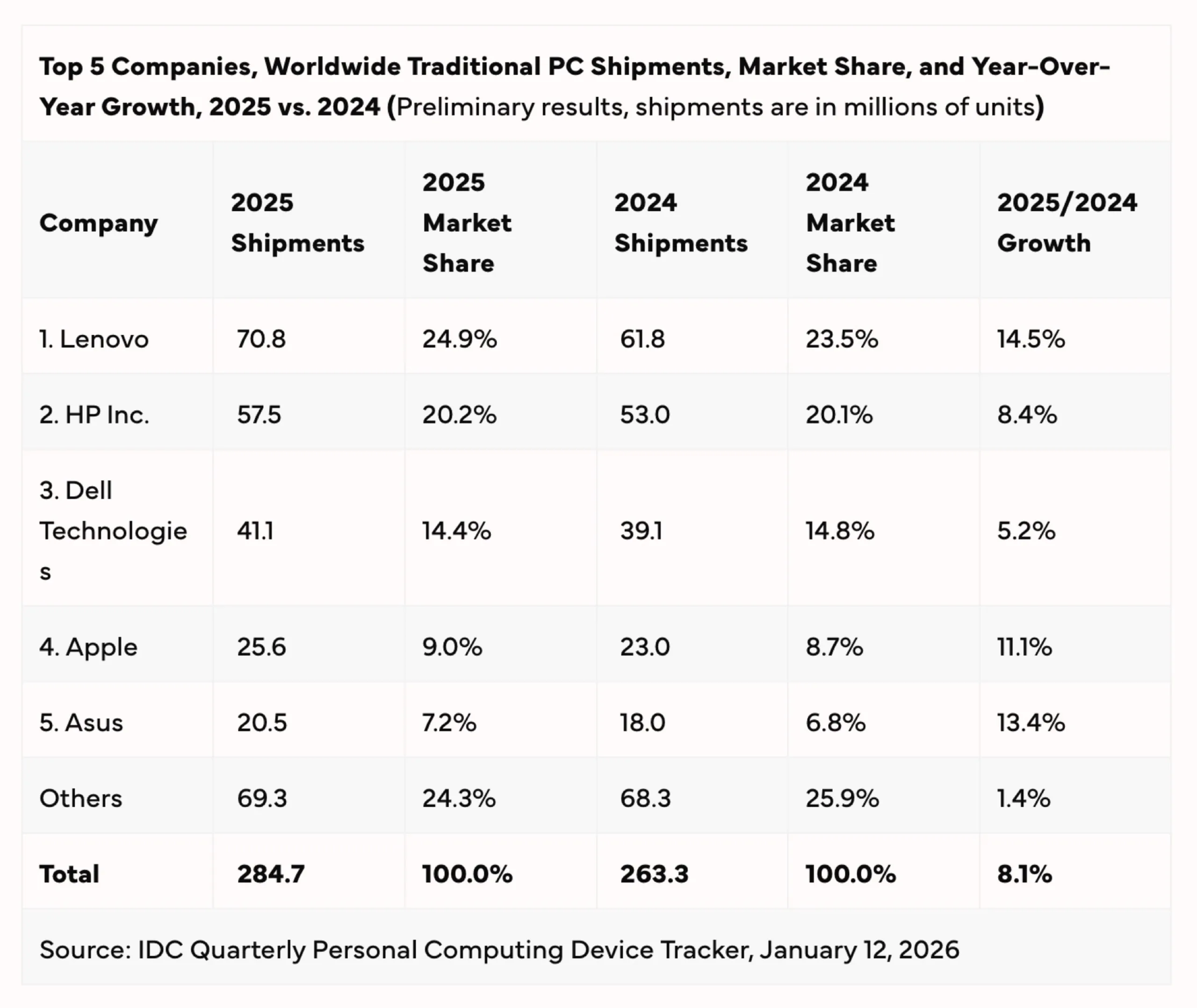 Gegen Ende des Jahres war die DRAM-Krise offenbar der Hauptgrund für die steigenden Absätze – Kunden wollten den erwarteten Preiserhöhungen zuvorkommen und noch einen PC zum erschwinglicheren Preis ergattern. Lenovo bleibt der Weltmarktführer im PC-Markt, denn der Konzern konnte im vergangenen Jahr 70,8 Millionen Computer verkaufen, und somit einen Marktanteil von 24,9 Prozent sowie ein Wachstum von 14,5 Prozent erzielen.