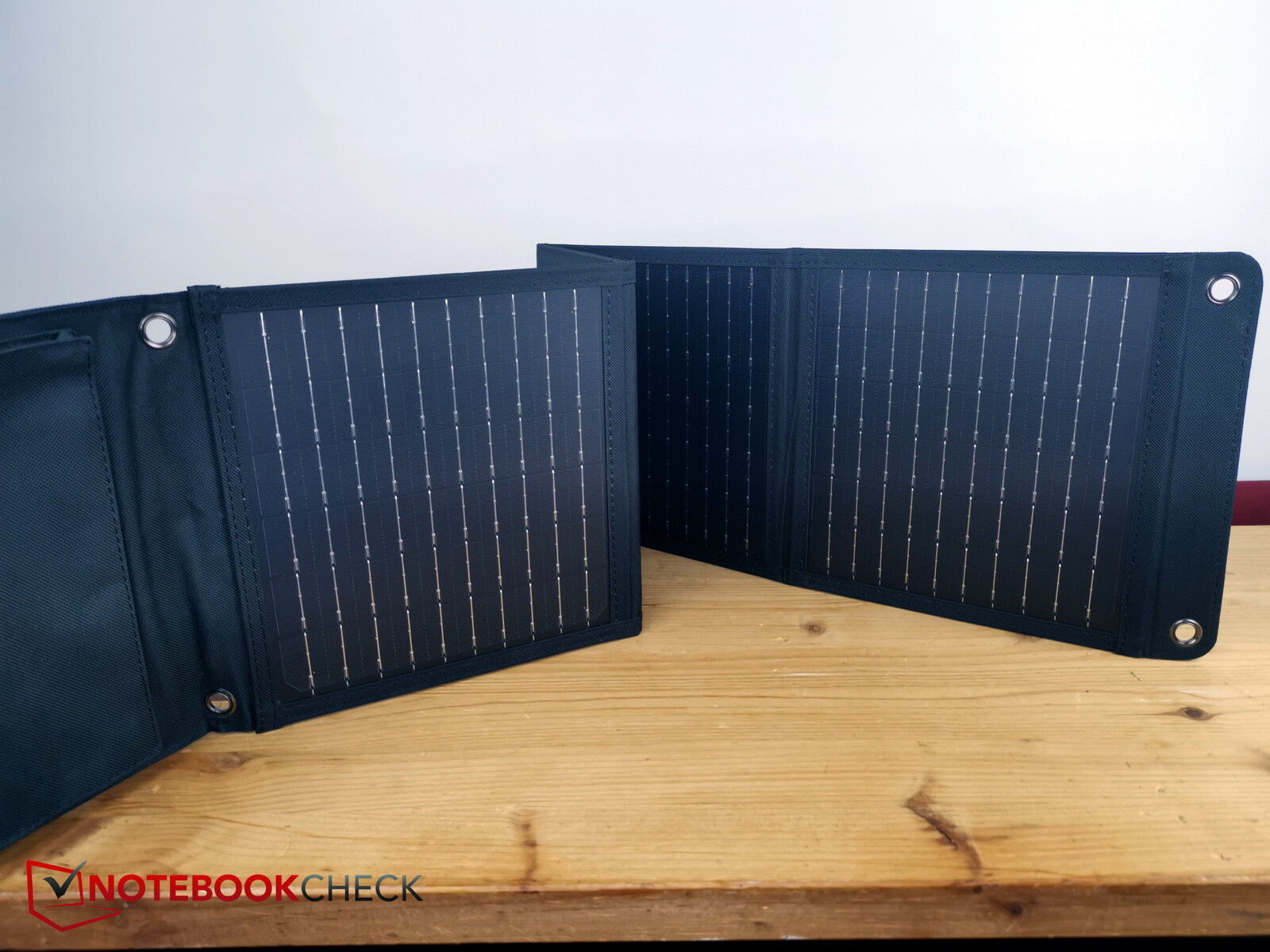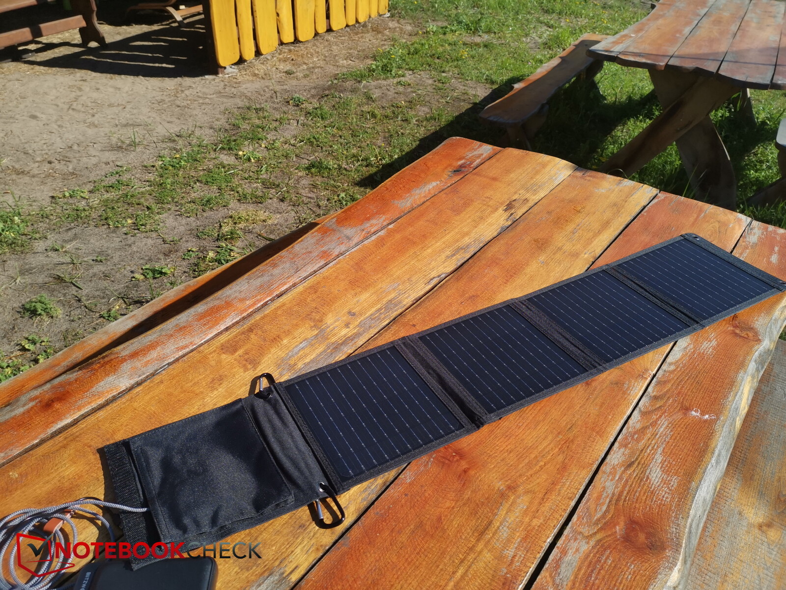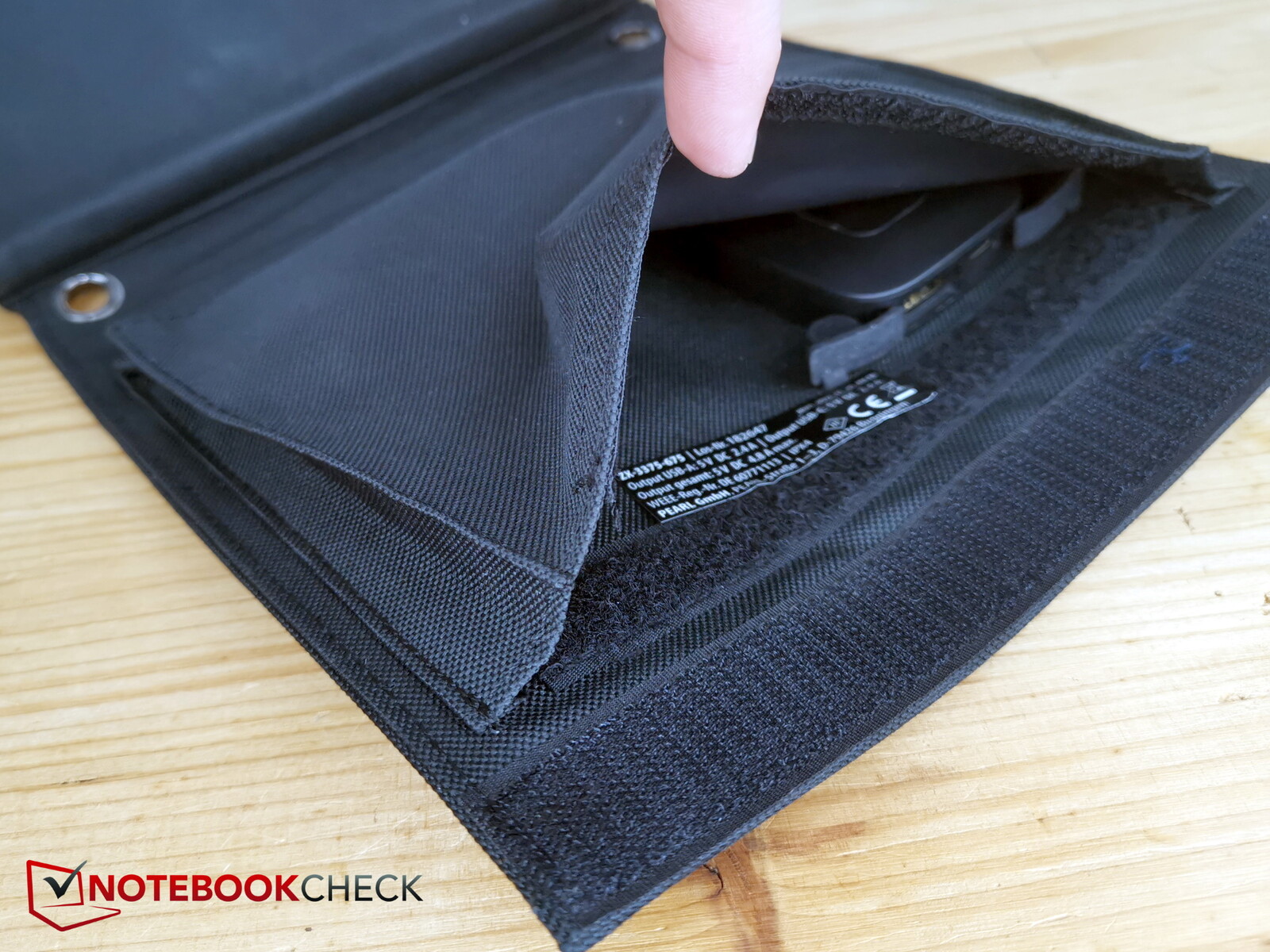 Klappt man es aus, so entfaltet das Panel seine insgesamt fünf kleinen Segmenten zu einer stolzen Gesamtlänge von 115 cm. Davon bestehen vier Segmente aus zusammenhängenden Solarmodulen, ein weiteres Segment ist als Tasche konzipiert und beherbergt den Wechselrichter mit Anschlüssen. Immerhin das Taschensegment kann man abknicken, sodass noch eine Länge von mindestens 88 cm verbleibt, die zur Sonne ausgerichtet werden möchte.