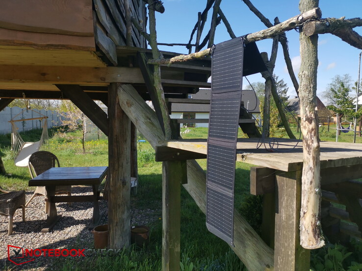 Während unserer dreitägigen Radtour haben wir das Faltsolarpanel auf verschiedene Weise genutzt: In der morgentlichen Sonne haben wir es an die Veranda unserer Airbnb-Unterkunft gehängt (s. Titelbild) oder auf den Tisch gelegt, auch an das Zelt ließ sich das Panel dank der Karabinerhaken und Ösen gut anbringen.