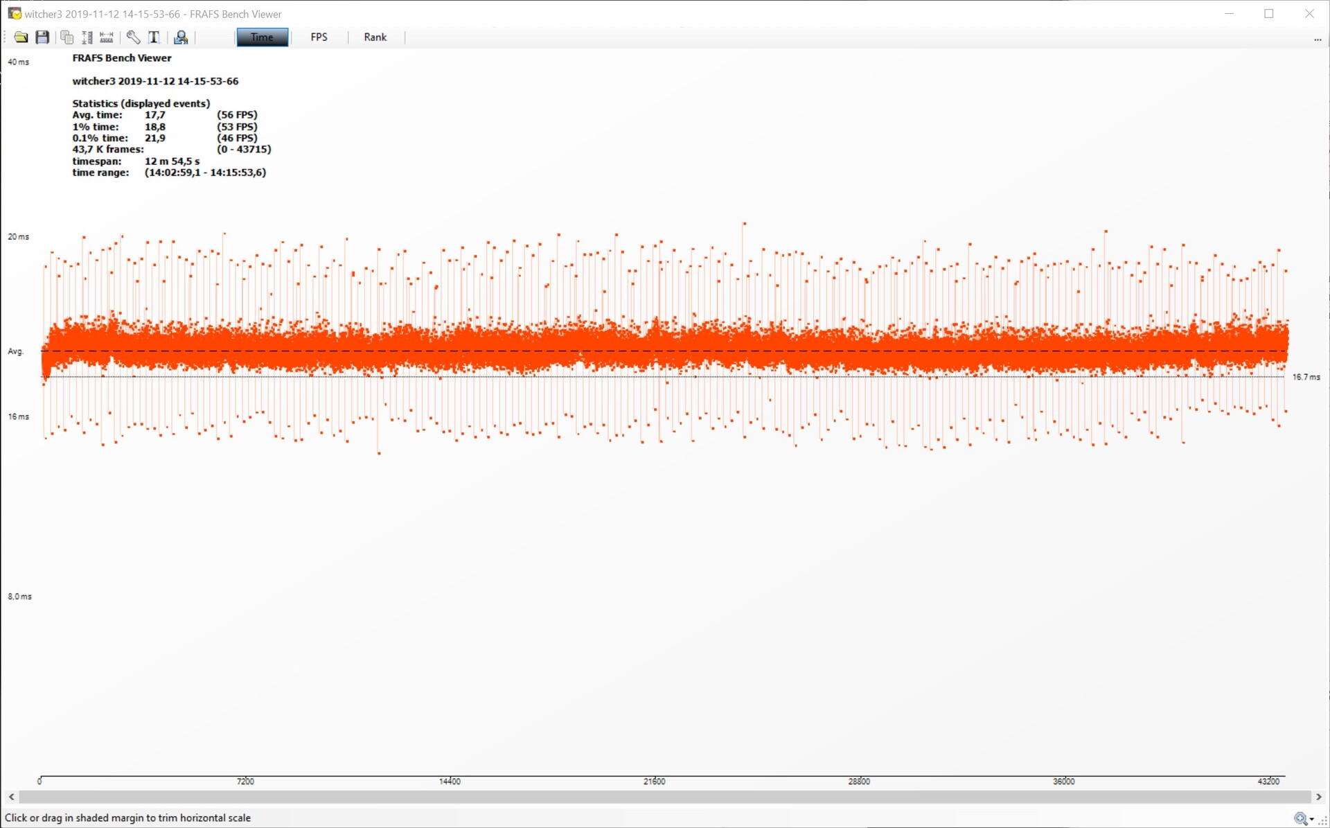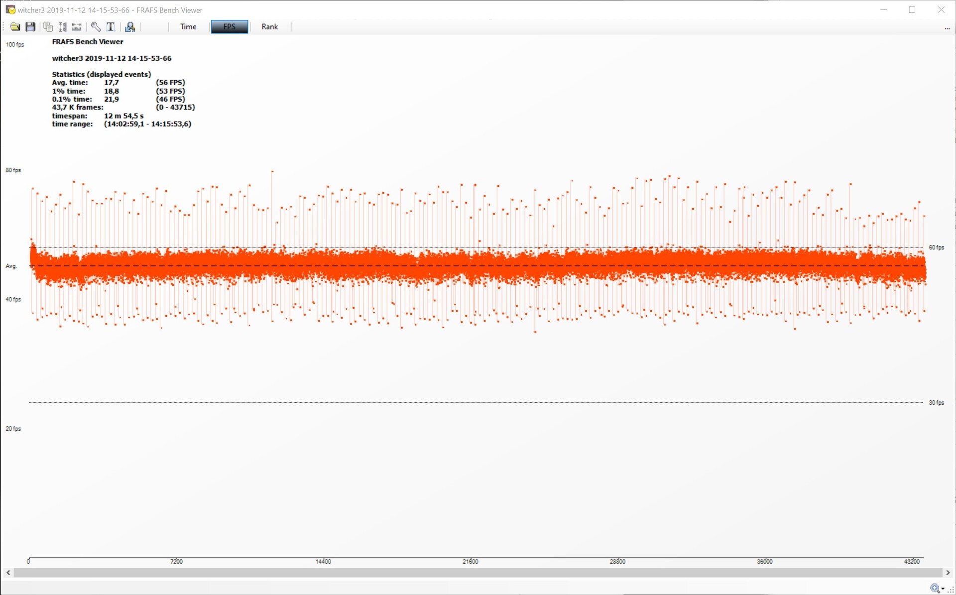 Beim Blick auf den Frameverlauf, welchen wir mit The Witcher 3 (Ultra-Preset) aufgezeichnet haben, zeigt sich, dass der verbaute Kühler der PNY GeForce GTX 1660 XLR8 Gaming OC mit der entstehenden Abwärme sehr gut zurechtkommt. Längere Spielesessions meistert die Grafikkarte problemlos und ohne Leistungseinbrüche. Mit durchschnittlich 56 FPS ist ruckelfreies Spielen garantiert und auch die Frametimes waren bei unserem Testsample eher unauffällig.