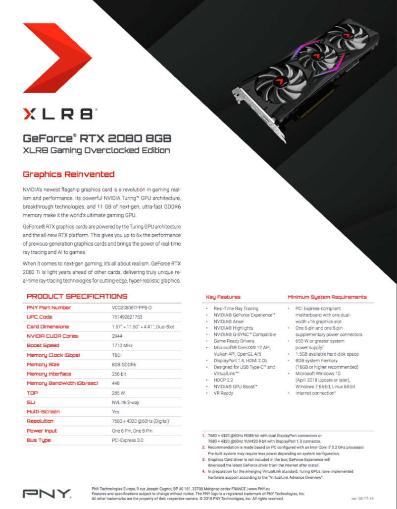 Nun hat PNY für kurze Zeit die Produktseiten der GeForce RTX 2080 8GB und der GeForce RTX 2080 Ti 11 GB veröffentlicht, konkret handelt es sich in beiden Fällen um eine vom Hersteller als XLR8 Gaming Overclocked Edition benannte Version.