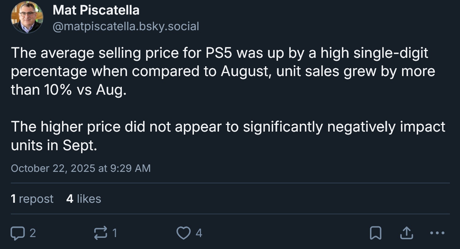 Matt Piscatella berichtete über eine Reihe von Bluesky-Beiträgen, in denen er feststellte, dass der „durchschnittliche Verkaufspreis der PS5 im Vergleich zum August um einen hohen einstelligen Prozentsatz gestiegen ist“. Trotz der höheren UVP stieg der Absatz im September um mehr als 10 %.