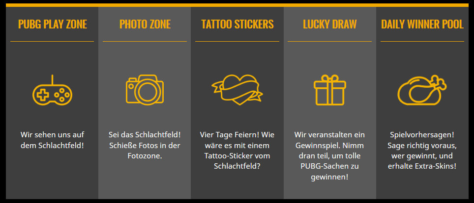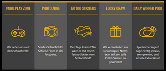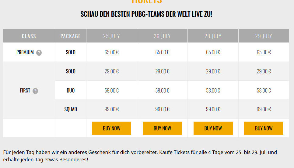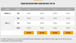 Premium (65 Euro/Ticket) und First Class (29 Euro/Ticket). Für alle, die das Event gerne in einer Gruppe besuchen möchten, sind First-Class-Tickets in Duo- (2-Personen-Pass)) und Squad-Paketen (4-Personen-Pass) erhältlich. Das Duo-Paket ist zum Preis von 58 Euro, das Squad-Paket zu einem reduzierten Preis von 99 Euro verfügbar. Alle Tickets bieten einen Tag Eintritt zum PGI 2018 sowie die Möglichkeit, ein Set aus In-Game-Items zu sammeln, das für das PGI exklusiv ist.