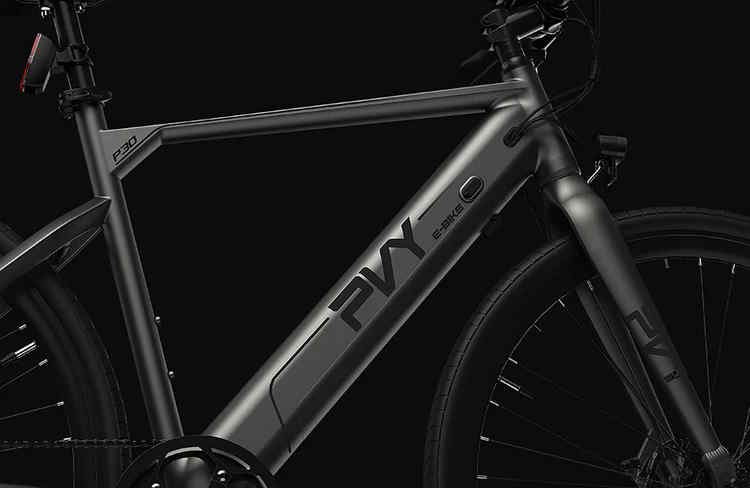 Das PVY P30 dürfte sich in erster Linie für die Nutzung in der Stadt eignen, so fehlt selbst eine Federgabel, im Lieferumfang enthalten sind auch keine Schutzbleche oder ein Gepäckträger, allerdings stehen ein Hinterbauständer und eine Beleuchtung zur Verfügung. Der Rahmen ist aus Aluminium gefertigt, das Gewicht wird von PVY auf 19,5 Kilogramm beziffert. Positiv: In den Rahmen ist der Akku integriert, wobei sich dieser trotzdem entnehmen lässt. Die Akkukapazität wird mit 486 Wh angegeben. Aufgezogen sind vorne und hinten 27,5 Zoll große und 2,1 Zoll breite Reifen.