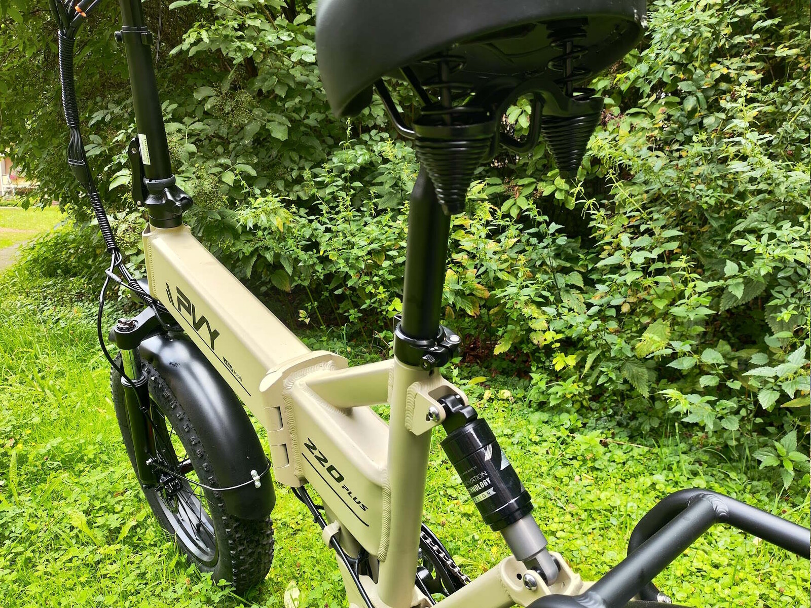 PVY sieht das PVY Z20 Plus auch für den Einsatz im Gelände taugliches Modell. Dafür ist das Fahrrad mit einer Federgabel, einem Dämpfer und auch einem gefederten Sattel ausgestattet. Zudem sind 4 Zoll große Reifen aufgezogen, das Potenzial zur Dämpfung von Bodenunebenheiten ist dementsprechend groß.