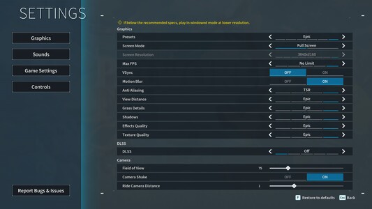 Hinzu gesellen sich optional VSync, Motion Blur und DLSS. Auf FSR müssen Spieler derzeit noch verzichten. Als Kantenglättung stehen FXAA, TAA und TSR zur Verfügung – letzteres wird standardmäßig bei den meisten Presets aktiviert. Allerdings wäre es schön, wenn die Entwickler noch Erläuterungen zu den einzelnen Settings nachreichen. Die Dauer des Spielstarts und die Ladezeiten fallen derweil zufriedenstellend aus. Grundsätzlich läuft Palworld schon jetzt ziemlich rund und flüssig, was für einen Early-Access-Titel keine Selbstverständlichkeit ist. Ähnlich respektabel sieht es mit dem Umfang aus. Auch spielerisch hat Palworld definitiv seinen Charme und motiviert zum Erkunden und Ausprobieren.