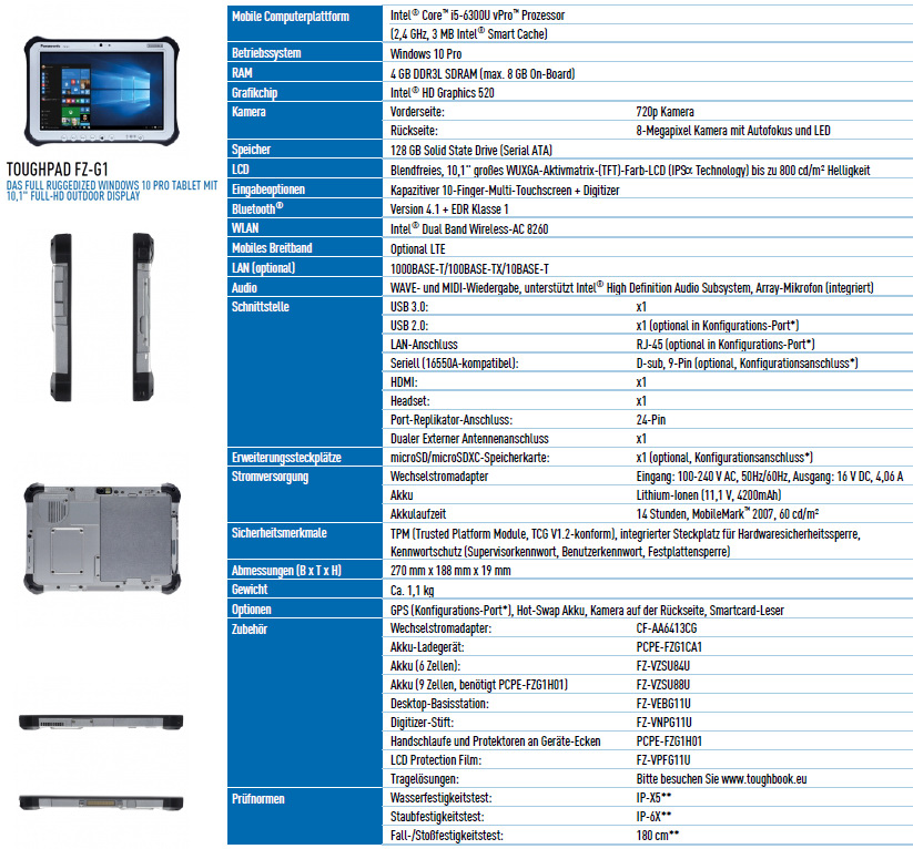 Zur Kommunikation und zum Anschließen von Peripherie verfügt das Fully-Ruggedized Toughpad FZ-G1 Tablet von Panasonic unter anderem über Bluetooth 4.1 + EDR, flottes WLAN 802.11ac, USB 3.0, HDMI-out, eine Soundbuchse, einen Port-Replikator-Anschluss (24 Pin) und optional auch über eine mobile LTE- und GBit-Lan-Unterstützung sowie wahlweise 1x USB 2.0 oder RJ-45 oder einen seriellen D-sub-9-Pin-Port (16550A-kompatibel). Details hierzu sowie zu weiteren technischen Spezifikation finden sie unten in der Bilderstrecke im Datenblatt.