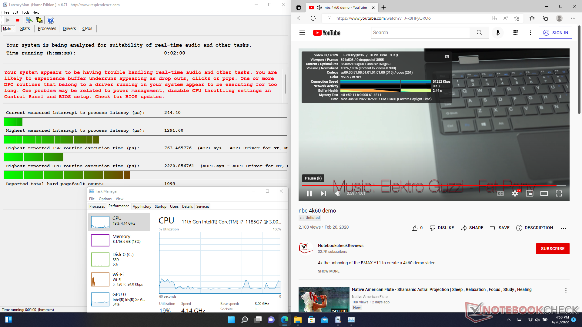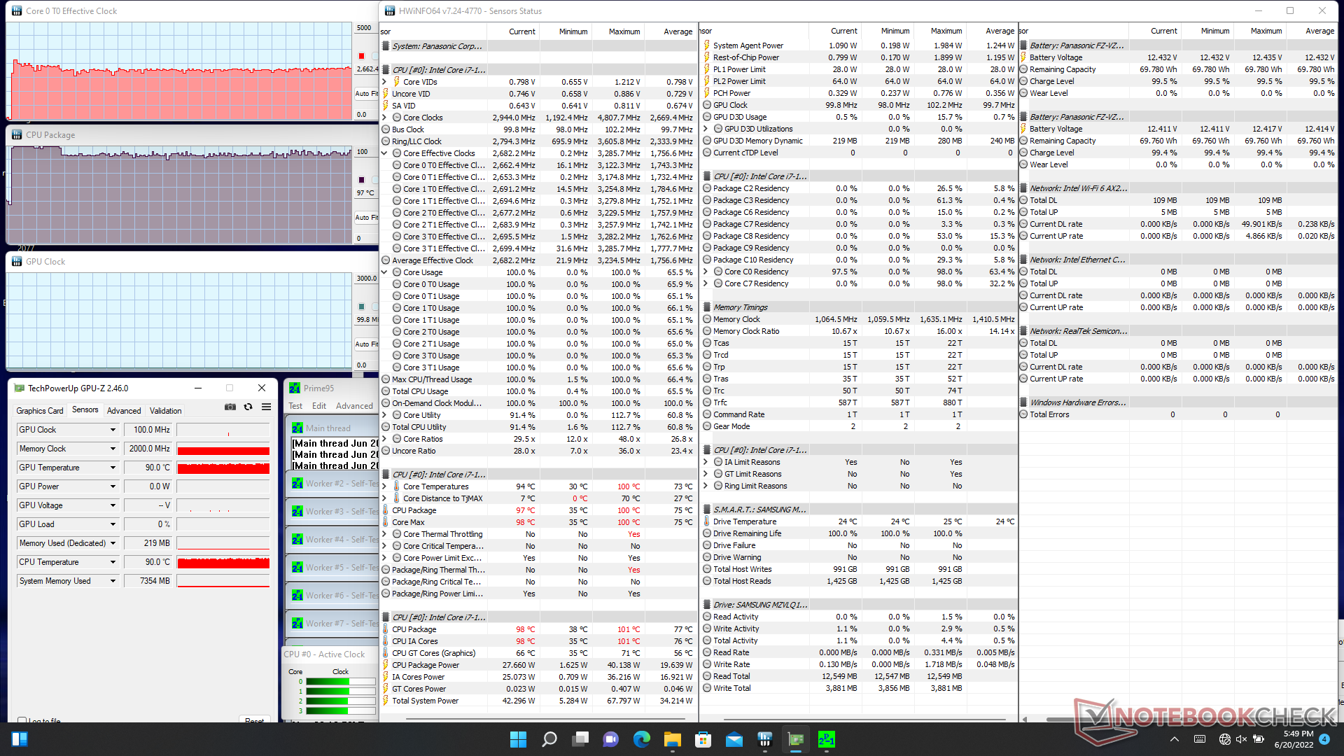 Wenn Prime95 ausgeführt wird, um Stress auf die CPU auszuüben, steigen die Taktraten und die Kerntemperatur für den Bruchteil einer Sekunde auf 3,1 GHz bzw. 100 °C, bevor sie kontinuierlich auf 2,6 GHz und ~95 °C sinken. Die Leistung des CPU-Pakets liegt zu Beginn des Tests bei 40 W, bevor sie sich bei 28 W stabilisiert. Den gleichen Test bei einem Durabook S14I mit einer Core i7-1165G7-CPU durchzuführen, würde zu einer viel kühleren stabilen Kerntemperatur von 63 °C führen, allerdings bei einer niedrigeren Taktrate von 1,8 GHz. Es ist klar, dass unser Panasonic Modell die CPU-Leistung bevorzugt, auch wenn das bedeutet, dass der Prozessor dabei viel wärmer wird.