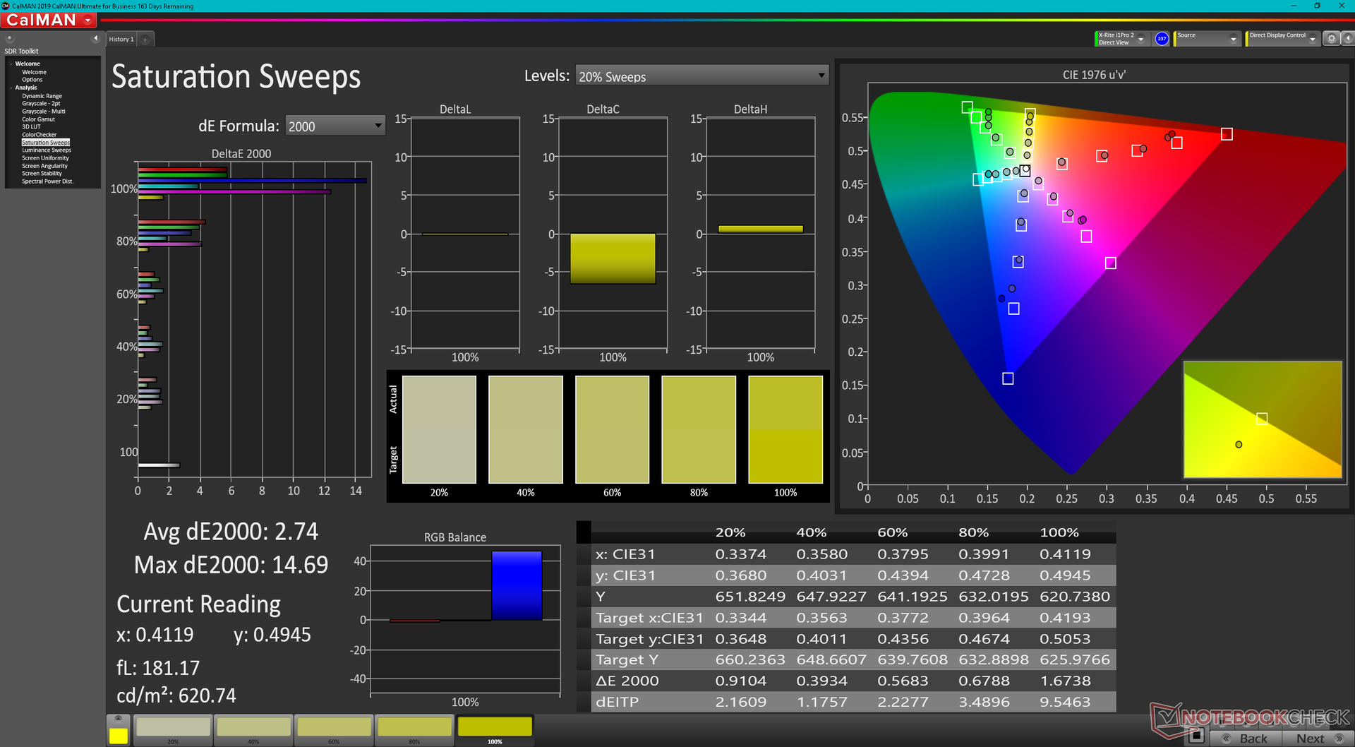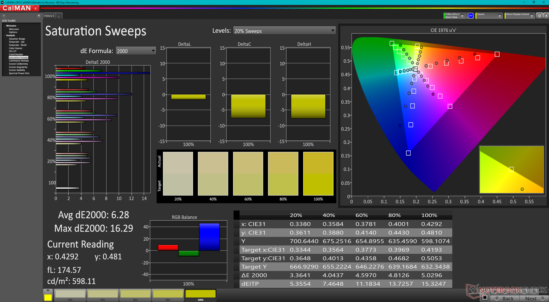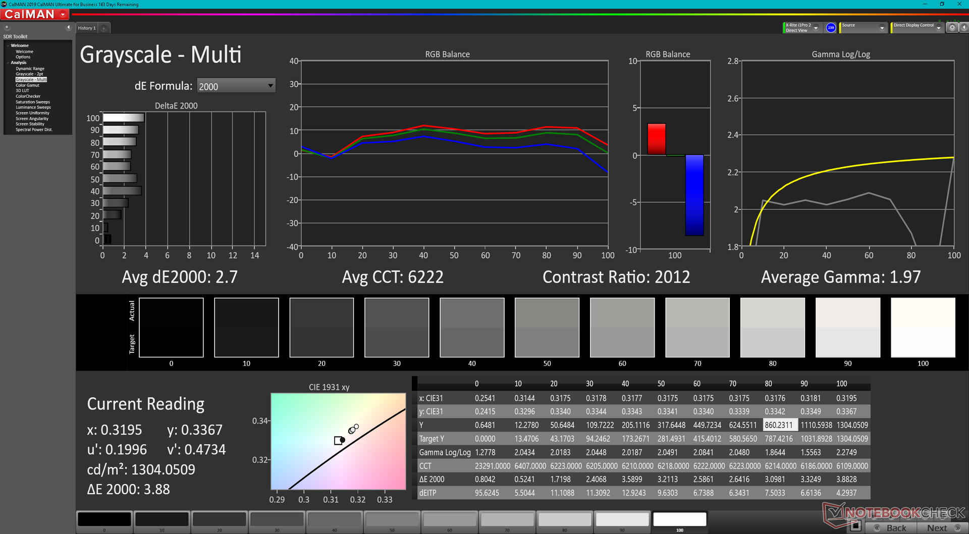 Das Display ist werkseitig nicht kalibriert. Eine Kalibrierung durch uns selbst würde die durchschnittlichen DeltaE-Werte auf breiter Front verbessern, aber gesättigte Farben werden aufgrund der oben erwähnten begrenzten sRGB-Abdeckung immer ungenau sein. Nichtsdestotrotz können Benutzer unser kalibriertes ICM-Profil anwenden, um das Beste aus dem Display herauszuholen.