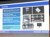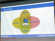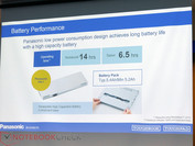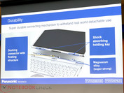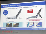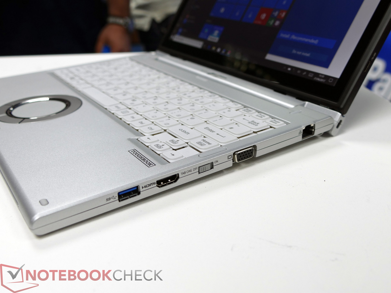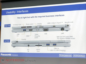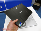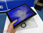 Beim Display greift Panasonic auf ein Panel im seltenen 3:2-Format zurück, das eine Auflösung von 2.160 x 1.440 Pixel bei einer Diagonale von 12 Zoll (QHD) bietet. Mit dem Format folgt man eigenen Angaben zufolge den Wünschen von Kunden, die hier Vorteile im Vergleich zu den bei Consumer- und Business-Notebooks üblichen Breitbildformaten sehen. Panasonic spricht zwar von einem "Anti Reflection Film", also einer Beschichtung, die Reflexionen abmildern soll, die gezeigten Vorseriengeräte neigten aufgrund der glossy Oberfläche allerdings doch erheblich zu auftretenden Spiegelungen.