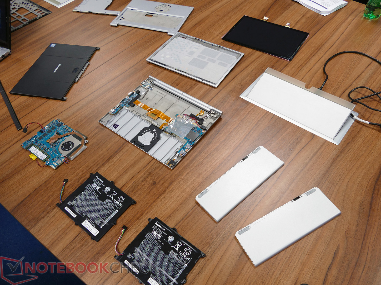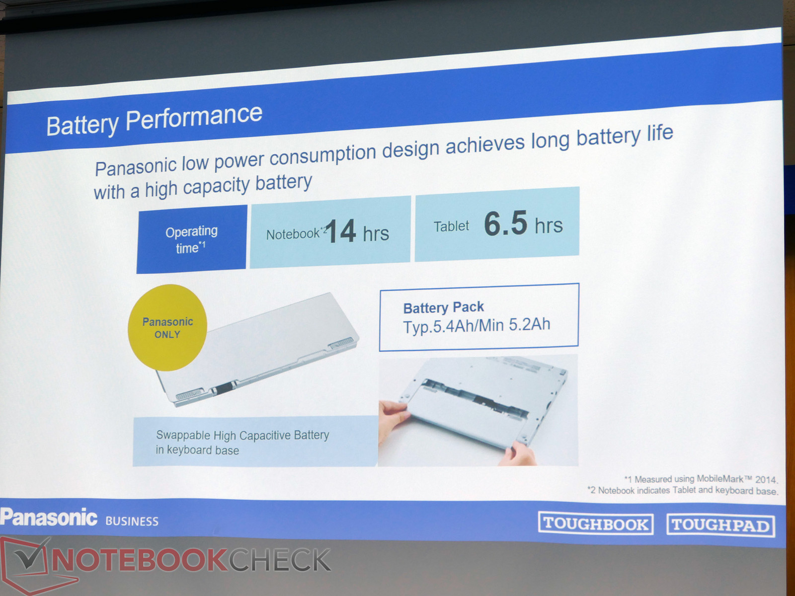 Auch beim Toughpad XZ6 stehen sich die widersprüchlichen Kriterien Rechen-Performance und Akku-Performance gegenüber. Ersteres will man durch den Einsatz einer vollwertigen Intel Core i5-7300U vPro CPU (2,6 bis 3,5 GHz) gewährleisten, die im Vergleich zu passiven Lösungen (Core-m) einen erheblichen Leistungszuwachs bringt und das Convertible auch als vollwertiges Arbeitsgerät klassifiziert. In Sachen Akkuleistung setzt Panasonic auf den Einsatz von zwei getrennten Zellen, wobei in der Tablet-Einheit ein Li-Ion-Akku mit 27 Wh verbaut wird, während die Basiseinheit nochmals eine für den User wechselbare Batterie mit 2x 20 Wh Kapazität integriert. In der Verwendung als Notebook will man damit bis zu 14 Stunden Laufzeit schaffen, als Tablet-only 6,5 Stunden (Mobilemark 2014). Ob diese optimistisch anmutenden Werte im Praxisbetrieb tatsächlich zu schaffen sind, hängt wohl sehr stark von den jeweiligen Anforderungen ab.