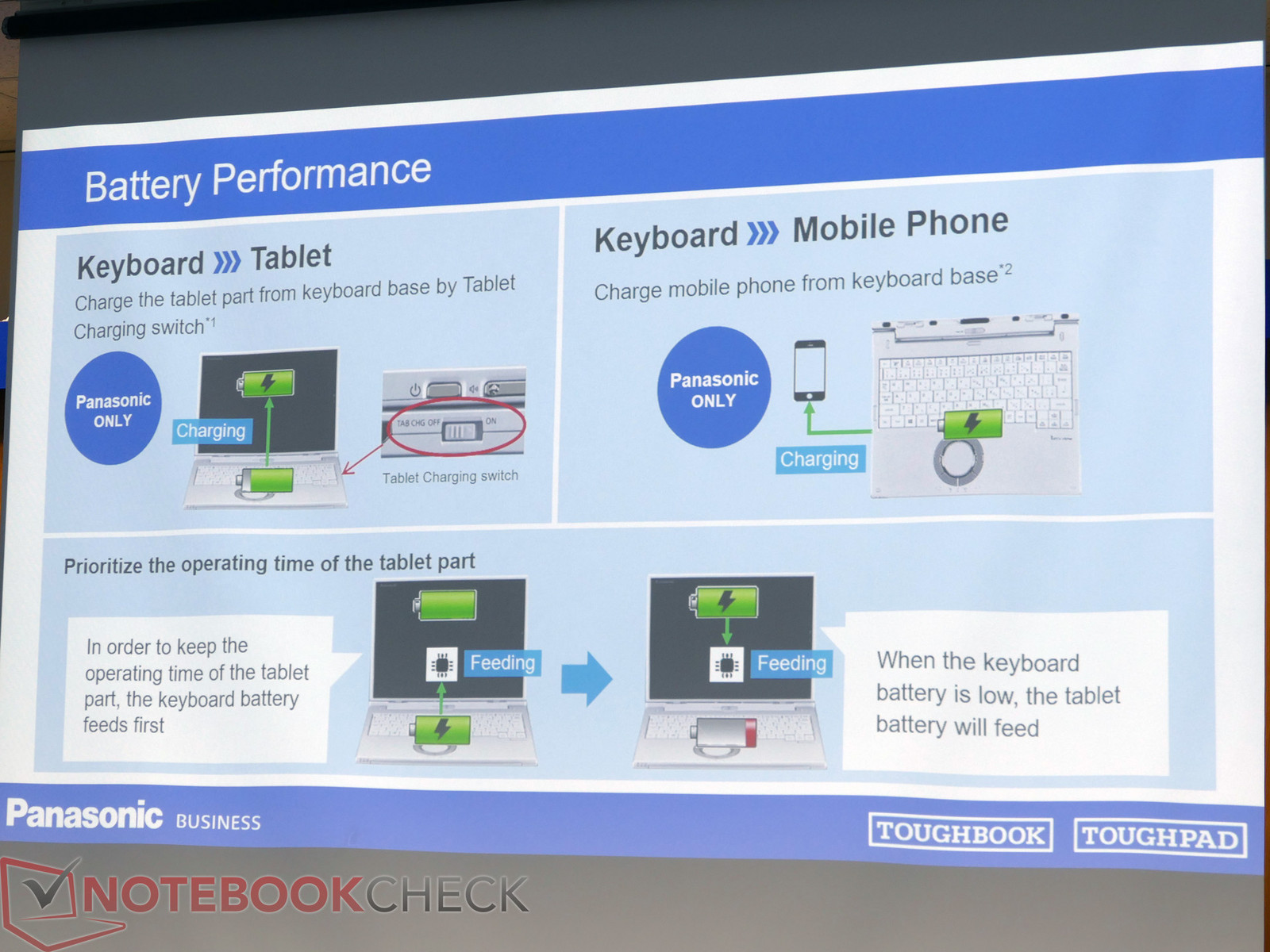 Im angedockten Zustand kann die Tablet-Einheit von der Basiseinheit geladen werden. Dafür sieht das CF-XZ6 sogar einen eigenen mechanischen Schalter vor. Natürlich kann die Basiseinheit auch zum Laden externer Geräte, etwa eines Smartphones, benutzt werden. Geht der Akku der Basiseinheit zur Neige, versorgt das Tablet diese weiterhin mit Energie, um alle Funktionen des Docks weiter nutzen zu können. Im Zusammenspiel von Tablet und Basiseinheit ist die Batterie in der Base auch "hot swapable", sprich kann im laufenden Betrieb gewechselt werden.