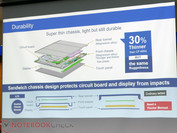Konstruktive Unterschiede zu üblichen Tablet-Produkten gibt es auch bei der Displayeinheit: So werden alle elektronischen Bauteile (Motherboard, Speicher, Akku, ...) von zwei Magnesiumteilen in Sandwich-Marnier umschlossen und so geschützt. Das eigentliche Display und das Touch-Panel sind dieser Konstruktion vorgelagert. So will man trotz besonders dünner Bauweise (unter 10 Millimeter) und geringem Gewicht (640 Gramm) eine überaus haltbare und robuste Tablet-Konstruktion geschaffen haben.