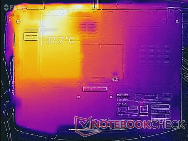 Die Oberflächentemperatur ist grundsätzlich auf der rechten Hälfte des Notebooks wärmer als auf der linken, da sich die Komponenten des Motherboard auf dieser Seite befinden. Im schlimmsten Fall erreicht die Oberfläche unseres Testgeräts 38 °C, wobei diese Temperaturen in der Nähe der Tastatur oder der Handballenablage nicht erreicht werden.