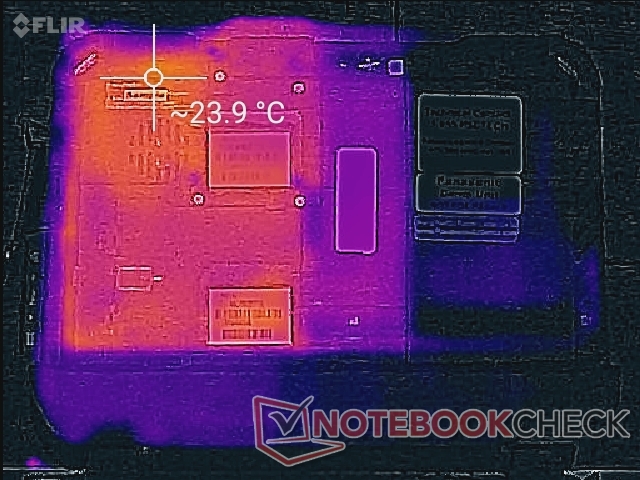 (+) Ohne Last messen wir eine durchschnittliche Temperatur von 24 °C auf der Oberseite. Der Klassendurchschnitt erreicht 29.5 °C.