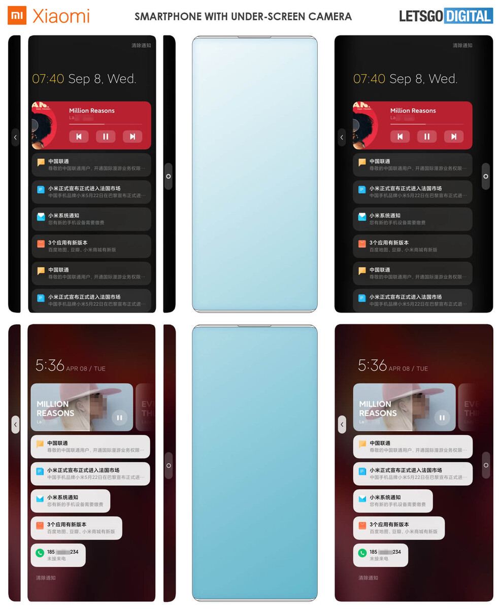 Das Patent zeigt ein Xiaomi-Smartphone mit einer in das Display integrierten Kamera und vor allem mit einem Bildschirm dessen Seiten so um 90 Grad abgerundet sind, dass das Display auch die Seitenränder links und rechts komplett bedeckt. Der Bildschirm erstreckt sich somit auch auf die Seitenränder und davon möchte Xiaomi auch starken Gebrauch machen.