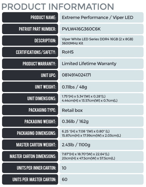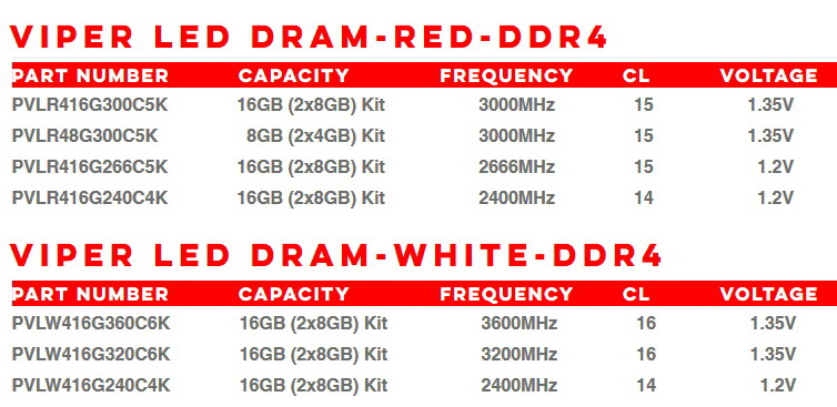 Die neuen Patriot Viper LED DRAM-RED-DDR4 und Viper LED DRAM-White-DDR4 LED-Speichermodule sind kompatibel zu Intels XMP 2.0 (Extreme Memory Profile) und in verschiedenen Kapazitäten als Sets mit 2x 8 GB und 2x 4 GB sowie Frequenzen von 2.400 MHz (1,2 Volt) bis 3.600 MHz (1,35 Volt) verfügbar.