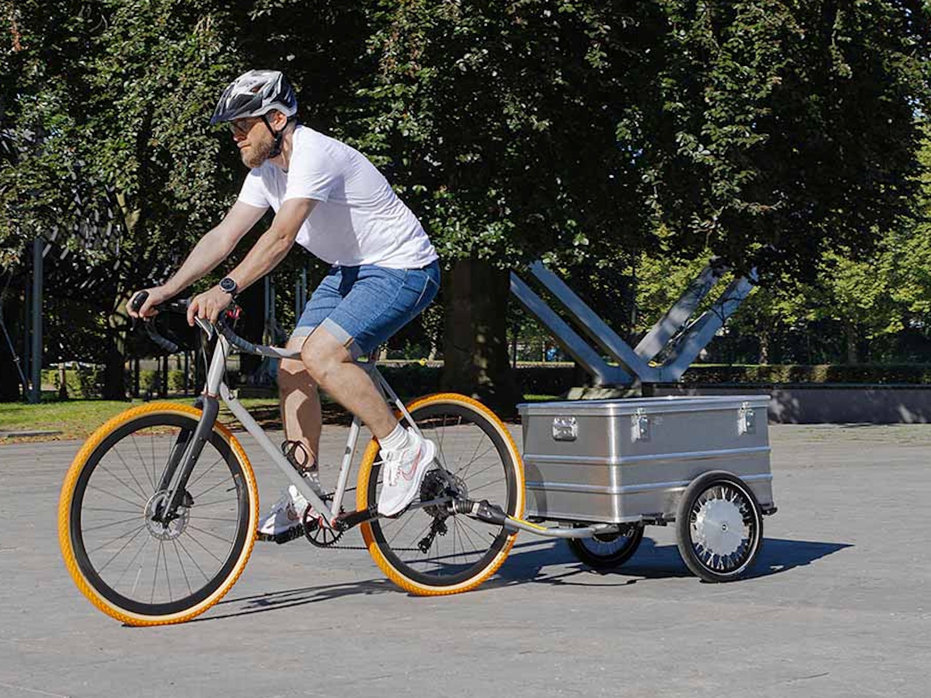 Die Ladefläche in der Transportbox wird mit 58 x 78 Zentimetern angegeben, dabei bietet die Box je nach Modellvariante ein Volumen von 156 oder 239 Litern. Die Montage an ein Fahrrad erfolgt über eine Tiefdeichsel. Dementsprechend muss das E-Bike eine solche auch unterstützen, allerdings ergeben sich davon abgesehen nur wenige Einschränkungen in Bezug auf das Fahrrad. Roland selbst präsentiert den Paxxter e auch in Kombination mit einem Rennrad.