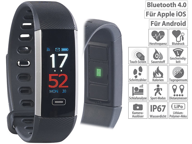 Der smarte Gesundheits-Tracker von Pearl erlaubt nicht nur die Messung von Blutdruck und Herzfrequenz. Pearls newgen medicals FBT-62.BD Fitnessarmband ermittelt über ein pulsoxymetrisches Verfahren auch die Sauerstoffsättigung des Bluts und zeigt alle ermittelten Vitalwerte übersichtlich auf dem 0,86 Zoll großen OLED-Farbdisplay des Trackers an. Alle Fitness-Daten lassen sich mit einer Gratis-App wie FitCloud vom Armband auf das Android-Smartphone, iPhone oder iPad übertragen.