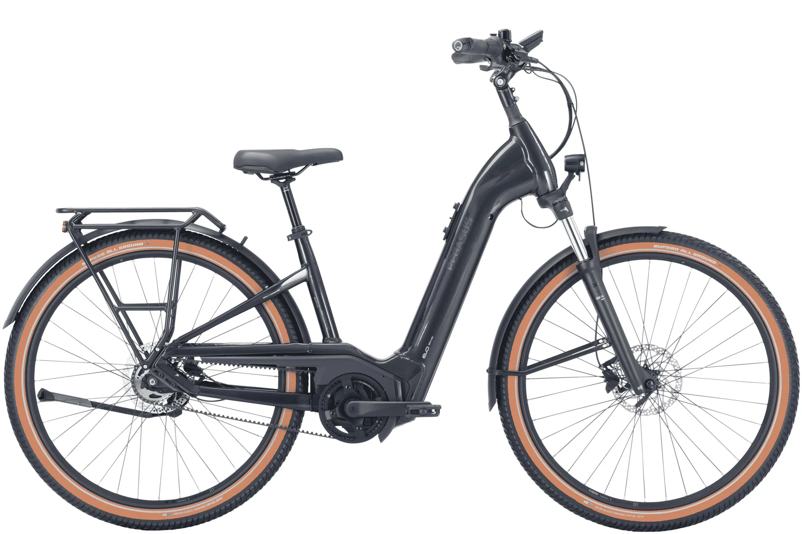 Die Kraftübertragung erfolgt mithilfe eines Carbonriemens. Ein solcher soll im Vergleich zu einer Kette wartungsärmer sein und benötigt keine Schmierung. Durch die Nutzung eines Carbonriemens ist folgerichtig auch keine Kettenschaltung realisierbar, stattdessen kommt eine Nabenschaltung zum Einsatz. Die Shimano Nexus-Schaltung wartet mit fünf Gängen auf. Hydraulische Scheibenbremsen von Shimano sind installiert.
