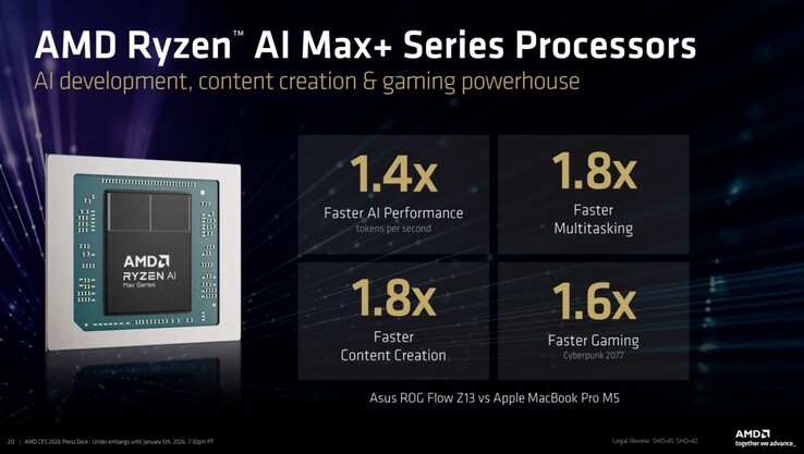 Laut AMD erreicht Ryzen Strix Halo eine 80 Prozent bessere Multitasking-Performance und eine 60 Prozent bessere Gaming-Leistung im Vergleich zum MacBook Pro mit Apple M5 (ca. 1.670 Euro auf Amazon). Allerdings hinkt dieser Vergleich ein wenig, da Strix Halo unter Last über 180 Watt Strom verbrauchen kann, der Apple M5 begnügt sich dagegen mit bis zu 30 Watt.