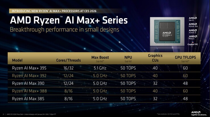 Bisher mussten Kunden aber zwangsläufig zum teuren AMD Ryzen AI Max+ 395 mit 16 Prozessorkernen greifen, um die AMD Radeon 8060S iGPU mit 40 Compute Units zu erhalten, denn die kleineren Strix-Halo-Chips boten nur die Radeon 8050S mit 32 Compute Units. Das ändert sich jetzt, denn mit dem Ryzen AI Max+ 392 und dem Ryzen AI Max+ 388 präsentiert AMD zwei kleinere Strix-Halo-Prozessoren mit zwölf bzw. acht CPU-Kernen und Boost-Taktfrequenzen bis 5,0 GHz, die jeweils mit dem schnelleren Grafikchip ausgestattet sind.