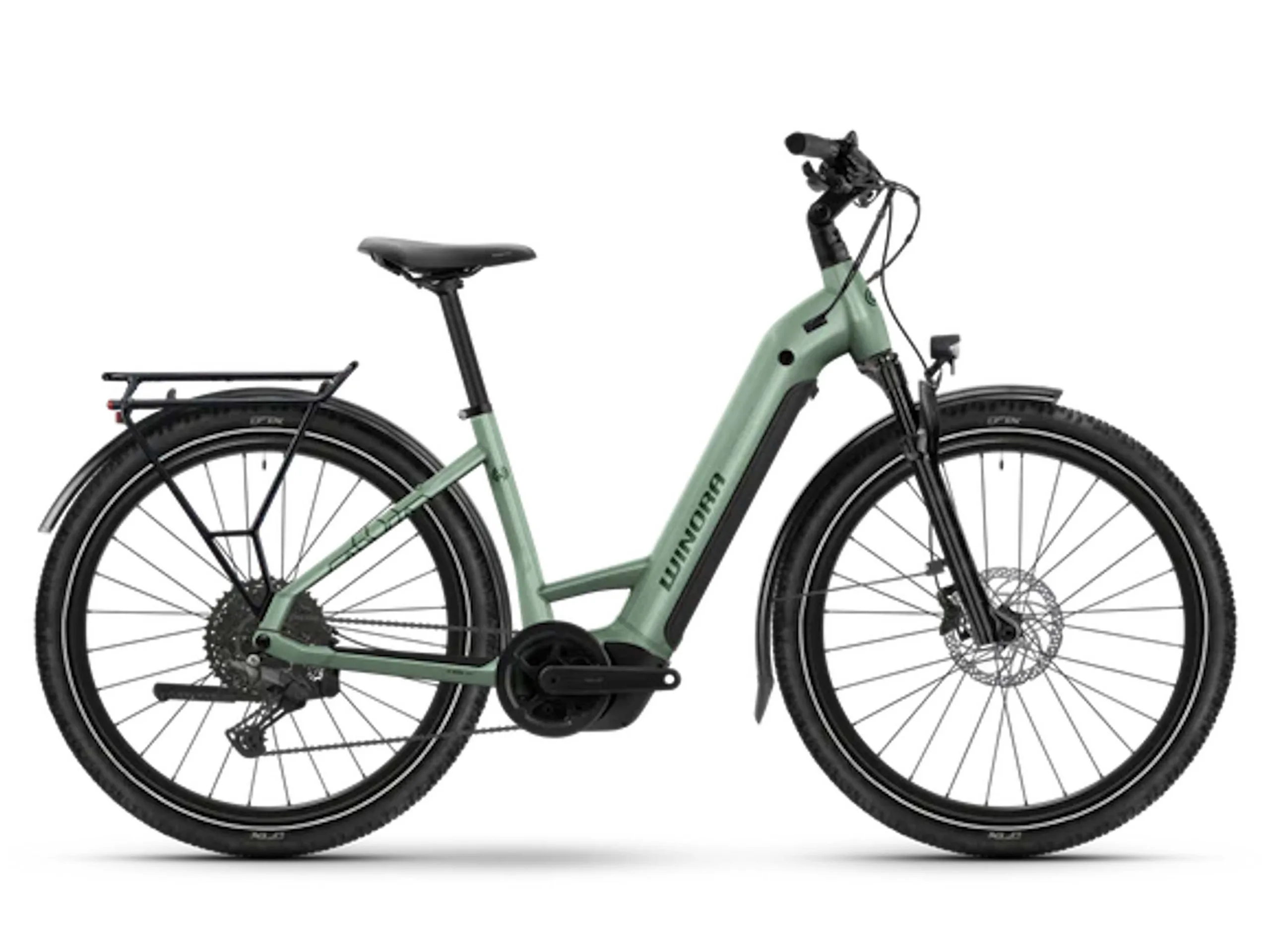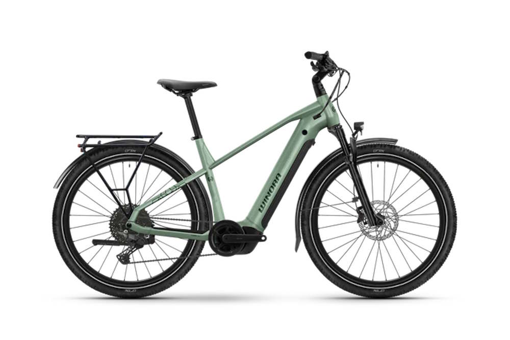 Winora verbaut eine Shimano Cues-Kettenschaltung mit zehn Gängen. Der verbaute Gepäckträger ist ein Systemgepäckträger und bietet zusätzliche Streben für die Befestigung von Packtaschen, dann mit etwas verringertem Schwerpunkt. Es gibt vorne und hinten Schutzbleche, einen Fahrradständer und eine Beleuchtung. Das Bosch Intuvia 100-Display ist noch relativ kompakt. Angegeben wird ein Gewicht von 27,5 Kilogramm, was natürlich nicht extrem leicht ist, für ein Trekking-E-Bike aber noch im Rahmen bleibt. Erhältlich ist das Fahrrad auch als Tiefeinsteiger.