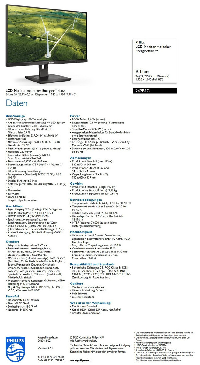 Zudem ist der TCO-zertifizierte Philips 242B1G zu 85 Prozent aus recyceltem Kunststoff gefertigt, frei von schädlichen Substanzen wie Quecksilber, Halogen oder PVC/BFR und er kommt in Verpackungsmaterialien, die samt und sonders zu 100 Prozent recycelt sind. Als Display nutzt der Philips 242B1G ein IPS-Panel mit Full-HD-Auflösung (1.920 x 1.080 Pixel), 102 % sRGB-Farbabdeckung, Betrachtungswinkeln von 178/178° sowie einer Bildwiederholfrequenz von 75 Hz. Zudem besitzt der 242B1G einen USB-Hub mit vier USB-3.2-Anschlüssen, von denen einer das schnelle Aufladen von Smartphones und ähnlichen Geräten unterstützt.