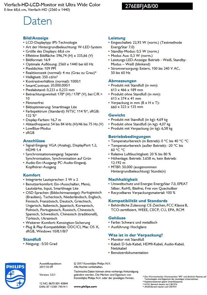 Das Gewicht des Philips 276E8FJAB beziffert MMD inklusive Standfuß auf knapp 4,7 Kilo. Der Energieverbrauch des Monitors beträgt eingeschaltet rund 23 Watt. Im Standby und ausgeschaltetem Modus verbraucht der Monitor 0,5/0,3 Watt.