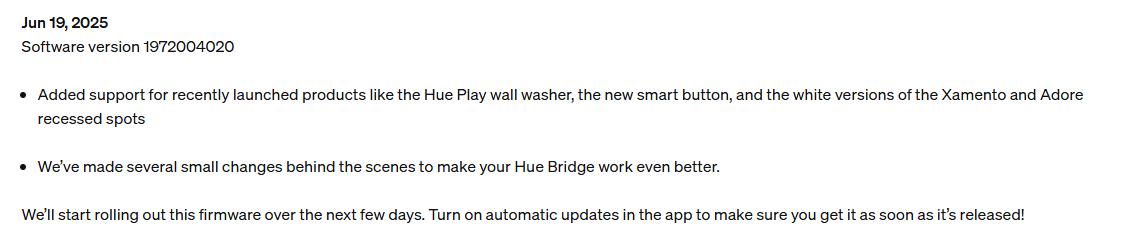 Laut den offiziellen Versionshinweisen bringt die neue Software Unterstützung für mehrere kürzlich eingeführte Produkte. Dazu zählen der Hue Smart Button v3, die weißen Varianten der Einbauspots Xamento und Adore sowie der Hue Play Wall Washer, der aktuell für 199,99 Euro bei Amazon erhältlich ist. Diese Produkte sind mittlerweile auch in der Philips Hue App integriert.