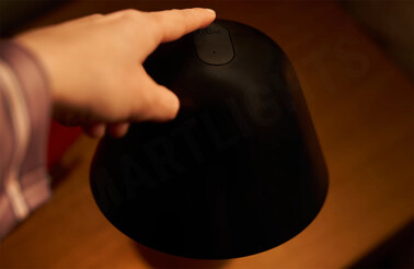 Wird der untere Schalter zwei Sekunden lang gedrückt, schaltet sich die Nachttischlampe von Philips Hue aus. Kurzes Drücken schaltet sie ein, während jedes weitere Drücken im eingeschalteten Zustand zum Switchen durch bis zu sechs hinterlegten Szenen führt.