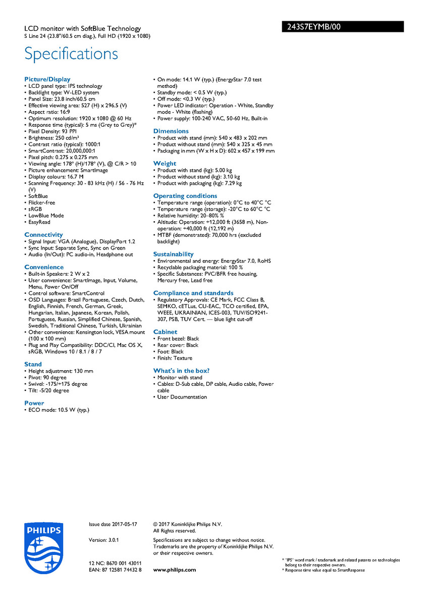 Als weitere Features nennt MMD für die Philips-Monitore eine "EasyRead-Option" für ein "papierähnliches Leseerlebnis" und "SmartContrast", mit dem der Monitor abhängig vom angezeigten Inhalt, die Farben und Intensität der Hintergrundbeleuchtung automatisch anpasst. Die S7-Monitore verfügen zudem über eingebaute Stereolautsprecher.