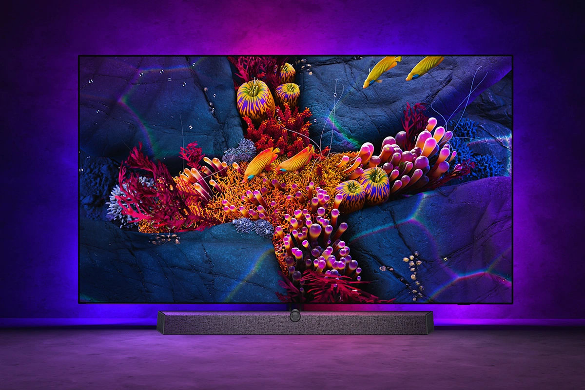 Der neueste Flaggschiff-Fernseher von Philips setzt auf die fortschrittlichsten OLED.EX-Panels von LG Display, die man beispielsweise auch im LG OLED G2 Smart TV (ca. 2.400 Euro auf Amazon) findet. Der Fernseher, der wahlweise mit einer Diagonale von 65 Zoll oder 77 Zoll erhältlich ist, bietet volle 4K-Auflösung und eine Spitzenhelligkeit von 1.300 Nits.
