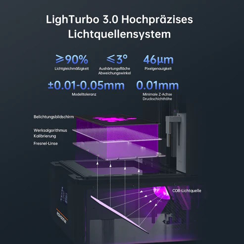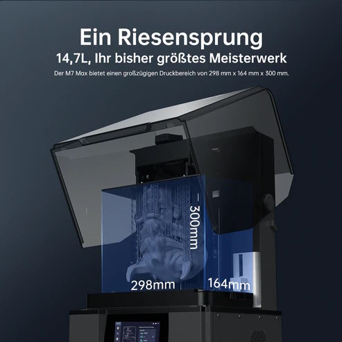 Der 3D-Drucker kommt mit einem 13,6 Zoll großem Bildschirm, welcher mit einer 7K-Auflösung kommt und mit 6.480 x 3.600 Pixeln auflöst. Die XY-Auflösung wird mit 46 x 46 μm angegeben, angegeben wird eine maximale Druckgeschwindigkeit von nur 4 Sekunden je Schicht - bei einer Schichthöhe von 0,05 Millimetern. Es soll eine Druckgeschwindigkeit von bis zu 31 Millimetern in der Stunde möglich sein, dieser Wert gibt quasi das Höhenwachstum des Modells an. Unterstützt wird ein Druckbereich von 298 x 164 x 300 Millimetern, dementsprechend lassen sich mit dem Resin-Drucker auch relativ große Modelle anfertigen.