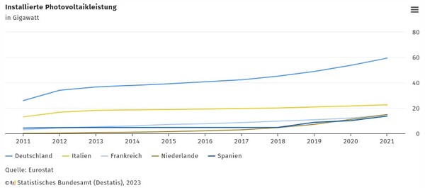 Die Solarenergie ist in Deutschland auf der Überholspur und die Nutzung von Solarenergie zur Stromerzeugung in Deutschland nimmt kontinuierlich zu - sowohl bei Unternehmen als auch bei privaten Haushalten. Laut dem Statistischen Bundesamt (Destatis) waren im März 2023 in Deutschland auf Dächern und Grundstücken insgesamt rund 2,6 Millionen Photovoltaikanlagen installiert. Diese Anlagen verfügten über eine beeindruckende Gesamtnennleistung von etwa 70.600 Megawatt. Dies verdeutlicht den wachsenden Trend, Sonnenenergie auch in Deutschland als eine nachhaltige und umweltfreundliche Stromquelle zu nutzen.