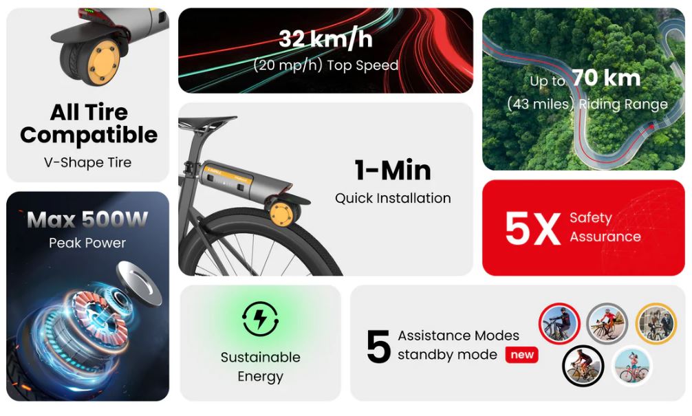 Nicht nur zur UNterstützung lässt sich der PikaBoost 2 nutzen, so erzeugt der Workout-Modus einen zusätzlichen Widerstand, womit sich auch bei einer geringeren Geschwindigkeit mit hohem Widerstand trainieren lassen soll - und zwar auch beim Gebrauch auf einem Rollentrainer. Dazu stehen noch ein Cruise-Modus und ein Eco-Modus zur Wahl, dazu kommt ein intelligenter Modus. Ein entsprechender Algorithmus soll eine smarte Steuerung der Unterstützung leisten können. Herstellerangaben zufolge lassen sich beim Abwärtsfahren mit einer Geschwindigkeit von 25 km/h noch bis zu 100 Watt erzeugen und die Energie zurückgewinnen, die Erzeugung elektrischer Energie ist auch beim Indoor-Training möglich. Die Reichweite des Akkus wird mit bis zu 70 Kilometern angegeben, mit einer optionalen 220 Wh-Akkulösung soll diese sogar bei 96 Kilometern liegen. Das System kann auch als Powerbank genutzt werden und bis zu 100 Watt ausgeben, die Aufladung ist mit 65 Watt in rund drei Stunden möglich. Die maximale Leistung des Motors wird mit 500 Watt angegeben - und die maximale Geschwindigkeit mit 32 km/h. Dass eine für den europäischen Markt gedrosselte Version auf den Markt kommt, ist nicht unwahrscheinlich.