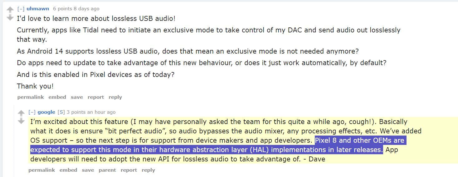 Das wohl spannendste Feature, insbesondere für audiophile Käufer eines Pixel 8 beziehungsweise Pixel 8 Pro ist Lossless Audio. Hierbei ist allerdings nicht der Bluetooth-Codec von Qualcomm gemeint, der leider weiterhin kaum verbreitet ist. Im Rahmen einer kürzlich abgehaltenen AMA-Session mit Dave Burke auf Reddit bestätigte der für Technik zuständige Google-Vizepräsident, dass Lossless USB-Audio via USB nicht nur bei einigen nicht näher genannten Android-OEMs auf der Agenda steht sondern im Rahmen eines kommenden Updates auch für Pixel 8 und Pixel 8 Pro geplant ist. Nähere Details zum Zeitplan lieferte Dave allerdings nicht.