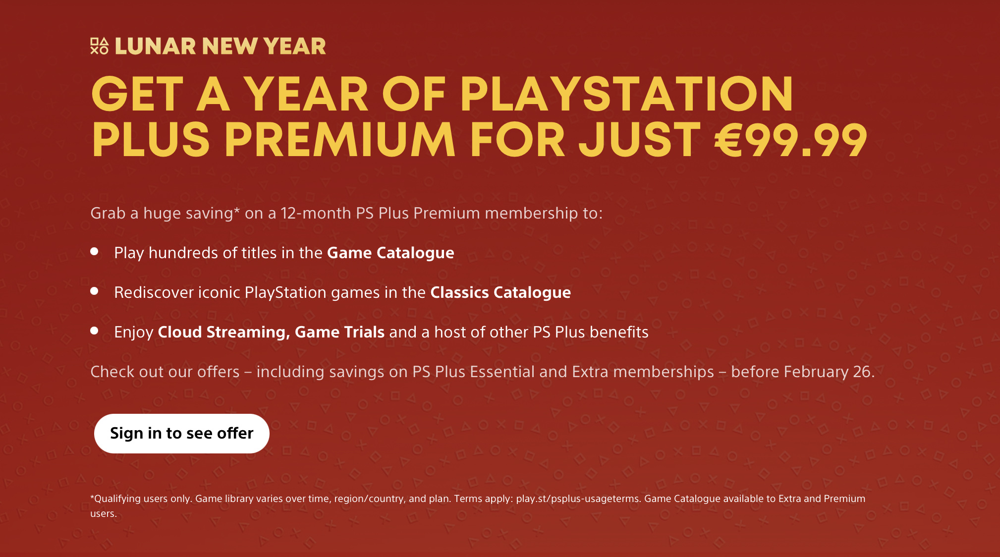 Im Rahmen des Lunar New Year-Sales bietet Sony ab sofort bis zu 35 % Rabatt auf die Premium-Mitgliedschaft von PlayStation Plus an. Neukunden erhalten die Premium-Stufe für 99,99 Euro und sparen damit deutlich gegenüber dem regulären Jahrespreis von 159,99 Euro. Es sei jedoch angemerkt, dass dieser Rabatt nur für das Jahresabo gilt, nicht für die monatliche Zahlung.