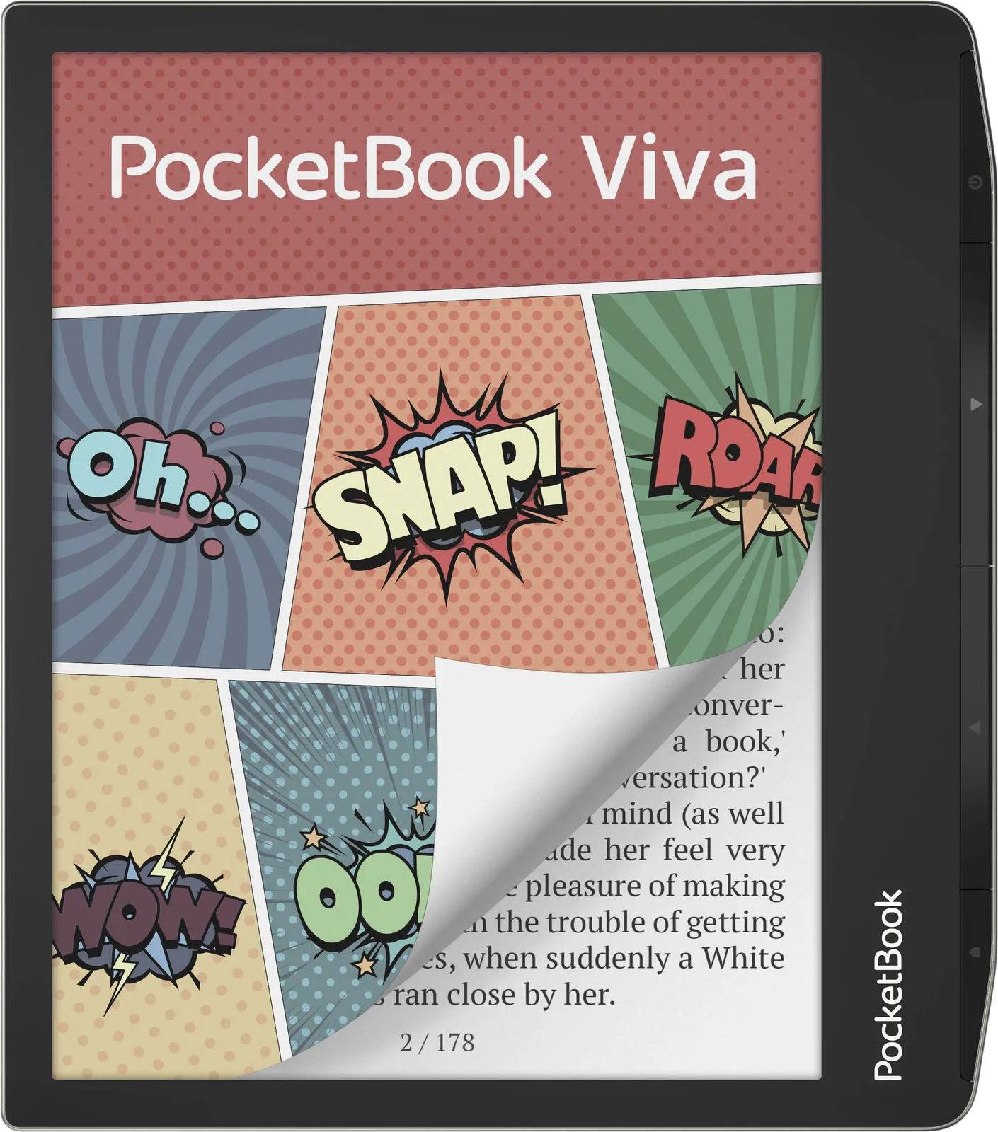 PocketBook hat mit dem Viva einen neuen E-Reader vorgestellt. Dieser basiert technisch auf dem E-Ink Gallery 3-Displays. Das acht Zoll große Display des PocketBook Viva bringt eine Auflösung von 1.440 x 1.920 Pixeln mit, die Pixeldichte liegt dementsprechend bei 300 DPI. Es soll das gesamte Farbspektrum abgebildet werden können, wodurch sich nicht nur wie üblich für E-Reader Sachbücher besonders augenschonend lesen lassen sollen, sondern auch beispielsweise Fachbücher und Comics.