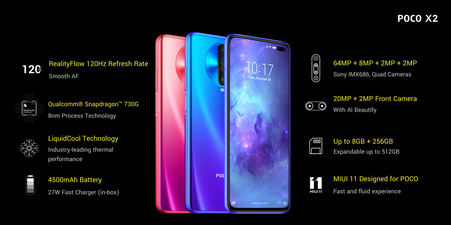 Vorgestellt wurde das Poco X2 aka Redmi K30 von Manmohan Chandolu, seines Zeichens General Manager bei Poco India. Wie erwartet präsentiert die Marke mit dem Poco X2 einen echten Premium-Midranger auf Basis des Qualcomm Snapdragon 730G, der von einer Heatpipe (LiquidCool Tech) gekühlt wird. Als Speicher spendiert Poco seinem X2-Handy modellabhängig 6 oder 8 GB RAM und 64, 128 oder 256 GB Systemspeicher.