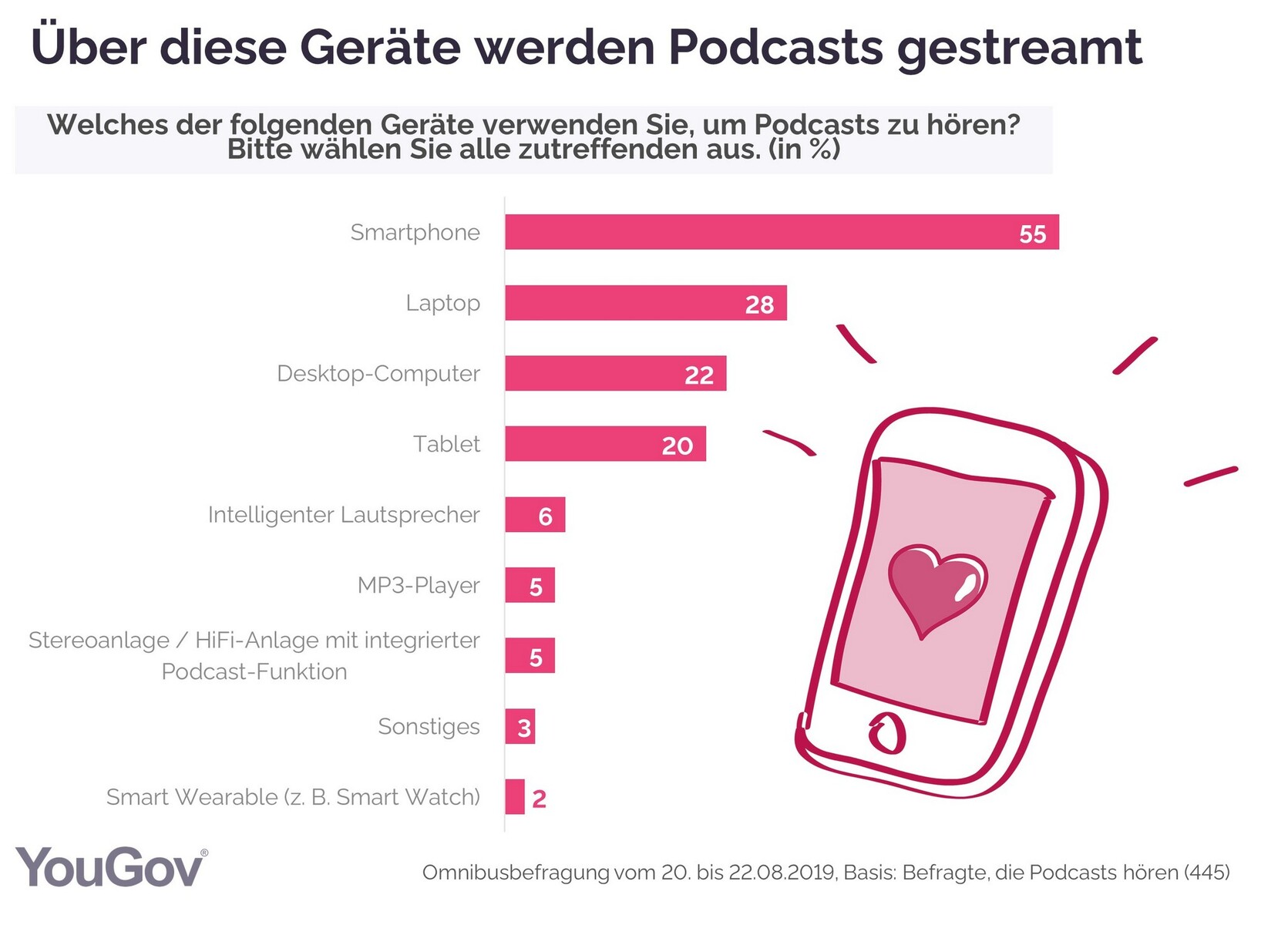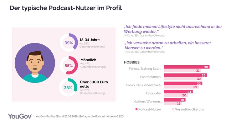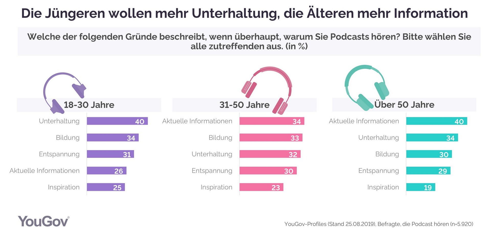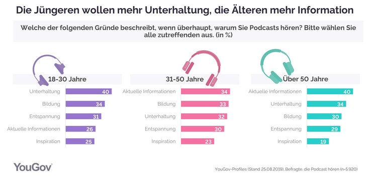 Diese Ergebnisse zur Nutzung von Podcasts in Deutschland sind Teil der aktuellen Analyse "6 Schritte zum erfolgreichen Podcast" der internationalen Data and Analytics Group YouGov. Eine wichtige Erkenntnis gibt es hinsichtlich dem Alter der Podcast-Hörer: Während jüngere Zuhörer mehr Spaß und Unterhaltung suchen, bevorzugen Ältere aktuelle Information. Demnach gaben Podcast-Nutzer über 50 Jahre besonders aktuelle Informationen (40 Prozent) als Grund zum Hören angeben, bei den 18- bis 30-Jährigen ist Unterhaltung (40 Prozent) auf Platz 1.