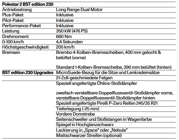 Polestar produziert insgesamt nur 230 Exemplare des Polestar 2 BST edition 230 Limited Edition für die europäischen und nordamerikanischen Polestar-Märkte. Der Polestar 2 BST edition 230 kostet 81.000 Euro, mit Rennstreifen 82.000 Euro. Der Polestar 2 BST edition 230 soll ab dem dritten Quartal 2023 an Besteller ausgeliefert werden.