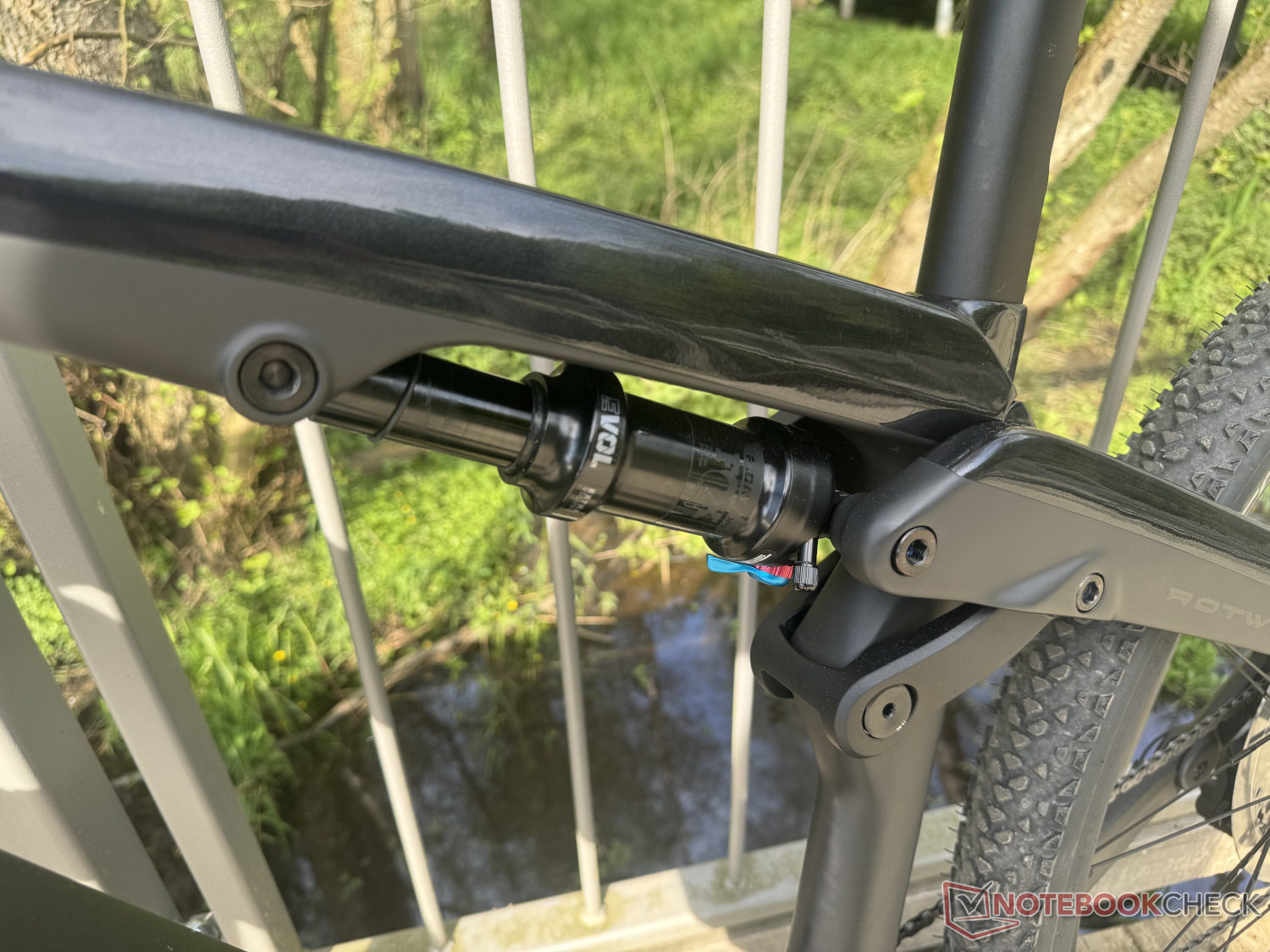 Aus seinem Elektroantrieb macht das Porsche E-Bike keinen Hehl. Das Unterrohr des vorne und hinten mit 100 mm Federweg vollgefederten Carbon-Rahmens in Schwarz mit dem integrierten sowie entnehmbaren Akku ist massiv und kantig gezeichnet. Auch der Motor im Bereich des Tretlagers versteckt sich nicht. Dazu thronen links und rechts am Unterrohr Porsche-Schriftzüge, vorne am Steuerrohr blitzt das goldfarbene Porsche-Logo. Understatement ist also nicht so die Sache dieses E-Bikes, würde aber irgendwie auch nicht so richtig passen.